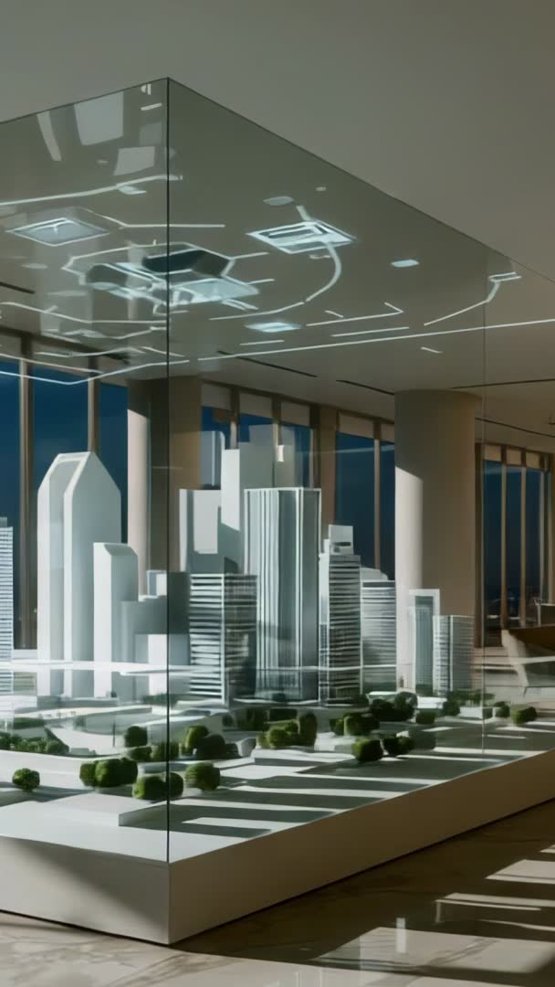 AI Generated Video. Showing futuristic scale model of city skyline inside glass studio with reflective ceiling and neon grid projection. Panning vertically across model while lights dim and grid pattern intensifies, creating cinematic high-tech atmosphere. Featuring minimal composition, clean architectural lines, and controlled depth of field for strong visual hierarchy. Designed for vertical 9:16 usage on mobile platforms, social reels, stories, and app headers. Working well for architecture firm promos, urban planning presentations, smart city concept videos, technology product launches, and innovation conference visuals. Allowing editors to add animated overlays, infographic callouts, voiceover narration, logo reveal, or color grading to match brand palette. Providing polished, modern look for corporate showreels, broadcast openers, trade show displays, and exhibition loops.