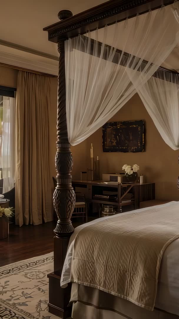 AI Generated Video. Vertical 9:16 footage showing luxurious carved four-poster canopy bed with sheer curtains gently swaying in breeze. Slow panning camera revealing quilted bedspread, carved wooden posts, bedside desk with decorative vases and warm ambient lighting. Warm neutral palette and soft natural light creating intimate, elegant mood suited for luxury hospitality and interior design projects. Footage working well as opening B-roll for hotel promo, boutique suite marketing, travel reels, room tour clips, lifestyle content, or calming background clip for voiceover. Composition providing negative space for text overlay or logo placement on upper or lower frame. Recommend gentle color grading to rich warm tones and slow-motion or 24–30 fps capture for cinematic effect. Ideal for Instagram Reels, TikTok, vertical ads, website hero banners, and commercial hospitality videos focusing on comfort, craftsmanship, and romantic getaway narratives.