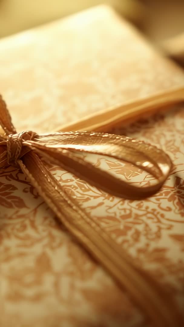 AI Generated Image. Camera panning across ornate patterned gift box, revealing drooping gold ribbon catching warm light. Close-up vertical footage highlighting texture of metallic ribbon, embossed wrapping paper, and soft bokeh background. Shot composing for vertical mobile screens, optimized for Instagram Reels, TikTok, Stories, and mobile ads. Use for holiday campaigns, celebration promos, luxury product showcases, wedding invitations, gift guides, and craft tutorials. Layering with text overlay or logo for social ads, adding slow motion or music for mood, or looping as background for online store banners and in-store digital displays. Color palette delivering warm gold and cream tones, conveying elegance and festive atmosphere. Footage working well as intro clip, transition, or product detail insert for lifestyle and ecommerce videos.