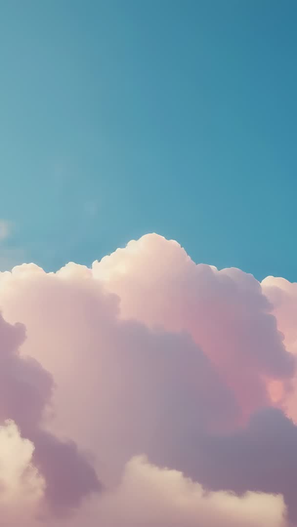 AI Generated Image. Camera panning upward across pastel cumulus bank, clouds drifting gently and rising into clear blue sky. Soft pink and peach highlights bathing cloud tops and creating dreamy, ethereal atmosphere. Vertical frame emphasizing scale and upward motion while leaving generous negative space for titles, logos, or captions. Footage working well for social media reels, app intros, wellness and meditation content, weather or nature segments, or calming background loops. Color grading-friendly clip for creating cinematic transitions, slow-motion edits, or overlay effects. Pairing suggestion: ambient music, soft piano, or guided voiceover for relaxation and inspirational projects.