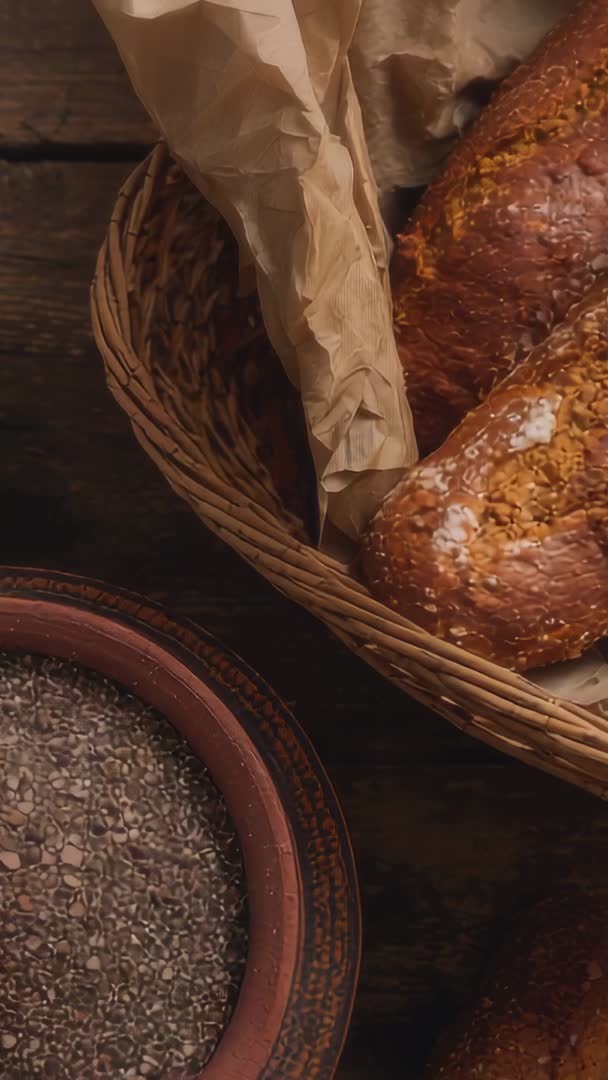 AI Generated Video. Warm rustic close-up vertical video panning across wicker basket filled with seeded loaves and baguette on dark wooden table with bowl of seeds. Natural warm lighting and rich crust textures creating cozy artisanal mood and tactile food appeal. Footage working well for bakery branding, social media reels, product promos, menu backgrounds, and recipe videos. Useful for homepage hero clips, Instagram stories, TikTok ads, and point-of-sale displays. Cropping-friendly for mobile vertical formats; slow pan providing breathing room for text overlay and logo placement. Perfect for promoting sourdough, artisanal baking courses, farmers market events, food packaging, or cookbook visuals.