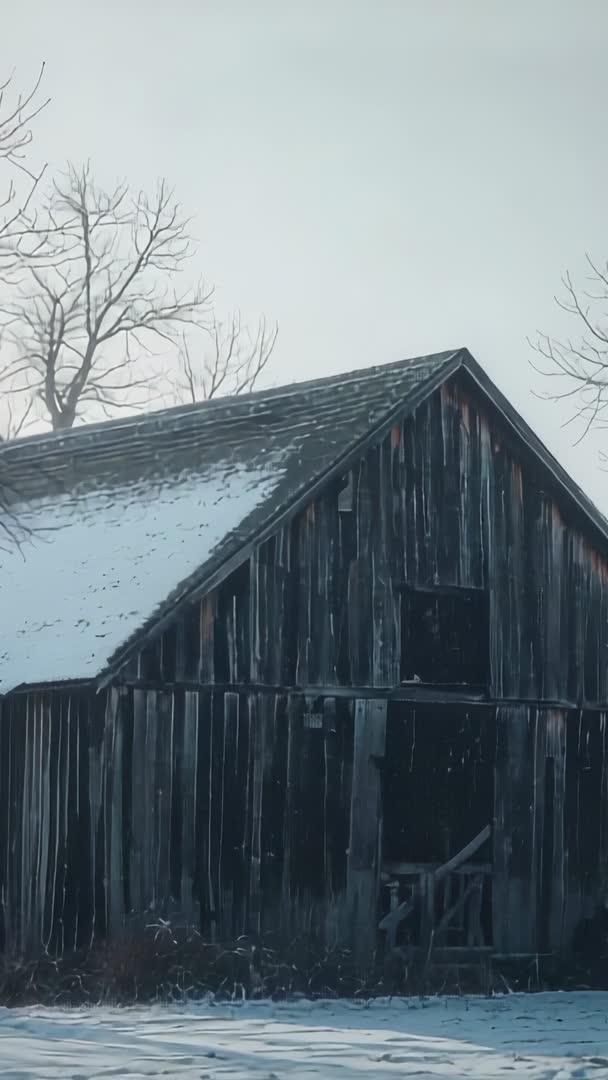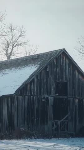 AI Generated Video. Offering moody winter atmosphere for rural storytelling and seasonal projects. Highlighting weathered wood grain, snow-dusted roofline, ladder silhouette, and leafless tree branches. Serving as cinematic establishing shot for short films, documentaries, historic restorations, and virtual tours. Optimizing for vertical mobile platforms, social media reels, and mobile advertising. Leaving space at top for title cards, captions, or logo overlay. Complementing editorial pieces on agriculture, cold-weather maintenance, heritage preservation, and rustic lifestyle. Recommending cool desaturated color grade and subtle film grain for nostalgic mood; allowing easy loop for ambient background or transition clip.