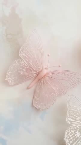 AI Generated Video. Panning vertical video showing pink translucent butterfly opening wings while rotating upward across pastel wall mural, revealing second butterfly entering frame. Soft blush and sky-blue wash creating dreamy, airy atmosphere with delicate wing veins catching light. Close-up composition and slow, smooth camera movement creating cinematic, meditative pace ideal for branded content. Use for Instagram Reels, TikTok clips, website hero loops, wedding invitation videos, nursery decor ads, beauty and jewelry promos, mindfulness app backgrounds, retail display content. Recommend pairing with gentle piano, ambient pad, or nature sound to enhance calming mood; enable seamless loop for continuous background use. Deliverables include vertical 9:16 format, high-resolution single take with natural motion and soft focus for easy editing and color grading.