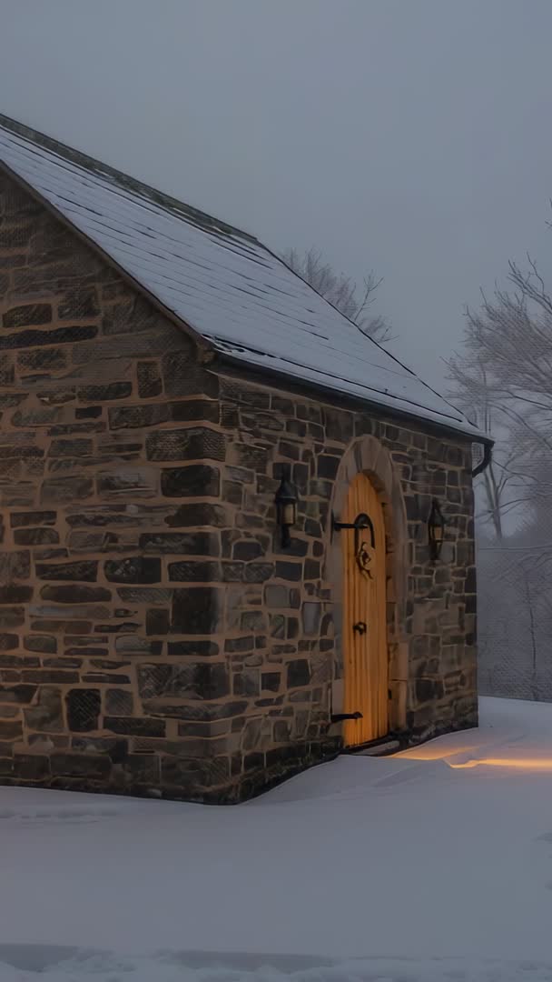 AI Generated Video. Showing vertical video panning across stone masonry outbuilding in fresh snow at dusk, focusing on arched wooden door warmed by lantern glow. Bare trees fading into foggy background, footprints crunching in foreground for added texture. Perfect for winter seasonal marketing, holiday greeting reels, architecture or heritage storytelling, real estate exterior highlights, cinematic B-roll for social channels. Leaving generous copy space in upper frame for overlay text, titles, or logo placement. Suggesting slow crossfade transitions, gentle color grading to enhance warm glow, and adding ambient wind or soft piano audio for mood.