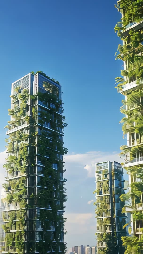 AI Generated Image. Vertical video panning right across green skyscraper towers wrapped in cascading vertical gardens against clear blue sky. Camera movement focusing on layered greenery, glass balconies, and modern structural lines while revealing distant city skyline. Composition providing tall copy space in upper frame for vertical titles, lower third graphics, or on-screen captions. Suiting sustainability campaigns, eco architecture portfolios, real estate marketing, urban planning presentations, and corporate branding. Ideal for social media vertical ads, Instagram Reels, TikTok promos, website hero backgrounds, documentary openers, and architecture showreels. Color palette featuring vibrant greens and cool blues while conveying innovation, biophilic design, and environmental responsibility. Delivering cinematic vertical framing for mobile-first audiences and motion-friendly edits.