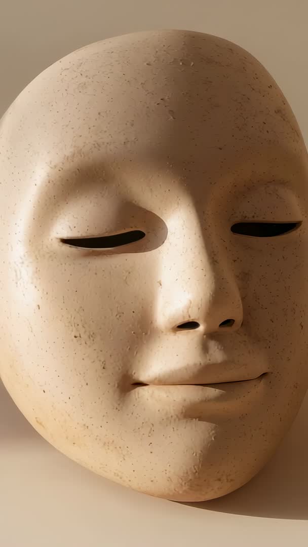 AI Generated Video. Vertical video panning across sculpted ceramic mask on table against beige wall, capturing warm light shifts and soft shadow play. Close-up framing highlighting textured plaster surface, gentle pores, subtle facial contours. Cinematic camera movement creating slow reveal from three-quarter angle to partial profile, evoking quiet mood and timeless craft. Useful for art documentary sequences, gallery promo reels, craft or ceramic tutorial openers, interior design mood reels, social media vertical ads, meditation and mindfulness app backgrounds, educational content on sculpture techniques. Editing tips: use slow cross-dissolve and gentle color-grading to enhance warm tones; add soft ambient music or subtle room tone; crop for mobile vertical platforms while preserving mask detail. Color palette suggestions: warm beige, cream, muted sepia accents and low-contrast shadows. Licensing ideas: hero clip for opening title, background loop for online store, texture overlay for mixed media projects.