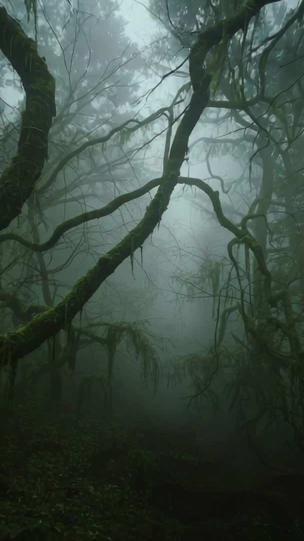 AI Generated Image. Vertical video panning and tilting through foggy moss-covered rainforest, showing twisted branches, hanging vines, and dense canopy fading into mist. Atmosphere creating mystical, immersive mood suitable for film openings, documentary montages, fantasy scenes, environmental campaigns, meditation apps, or social media vertical reels. Color palette featuring deep greens and muted teal tones for moody cinematic look; light shafts and soft contrast adding depth. Sound design recommendation: adding distant bird calls, dripping water, low wind ambience to enhance immersion. Technical notes: vertical orientation, slow motion panning, low light, shallow depth of field; footage loop-friendly for seamless background use.