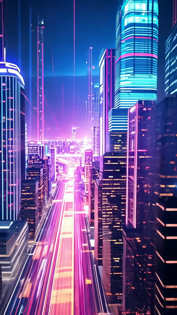 AI Generated Image. Vertical video footage showing aerial pan through neon-lit cyberpunk boulevard, featuring cyan-striped tower rising above skyline. Camera panning along vibrant corridor of skyscrapers while light trails streak down boulevard, creating motion blur and sense of speed. Color palette combining electric cyan, magenta and deep blue, producing synthwave retrofuturistic mood and high-tech atmosphere. Serving as background for tech commercials, app intros, startup promos, sci-fi trailers, music visuals, TikTok and Instagram Reels, vertical ad campaigns, product demo videos, motion graphics projects, livestream virtual backgrounds, editorial features on urban futures and architecture. Editing suggestions: Trimming to 9:16 aspect ratio, looping seamless segments for background playback, overlaying bold titles or lower thirds in contrasting color, adding synthwave soundtrack and subtle lens flares to enhance neon glow. Footage working well with fast cuts, glitch transitions, and color grading that emphasizes cyan and magenta tones.