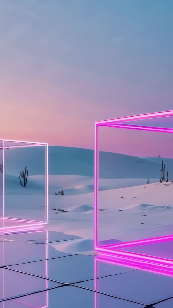 AI Generated Image. Featuring neon pink wireframe cube centering over reflective tiled floor, white wireframe cube receding into distance while camera panning through pastel desert dusk. Emphasizing contrast between geometric neon frames and organic dune contours, creating surreal minimalist atmosphere with soft pink and blue tones. Suiting technology promos, music video intros, social media reels, startup presentations and futuristic brand campaigns. Serving as looping background for live stream visuals, VJ sets, product reveal scenes and user interface demos. Providing high visual impact for title sequences, editorial layouts, motion graphics projects and contemporary art installations.