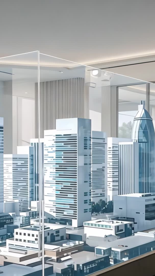 AI Generated Image. Video showing vertical pan reveal of glass-encased scale city model inside modern showroom interior. Camera moving smoothly while capturing detailed miniature skyscrapers, streets, rooftop features, and reflective glass surfaces. Lighting creating soft highlights and subtle shadows, enhancing depth and architectural detail. Composition emphasizing scale relationship between high-rise towers and low-rise blocks, conveying urban planning and development concepts. Use for architecture firm portfolio reels, urban planning presentations, real estate development pitches, design studio showreels, trade show loop displays, investor update videos, website hero backgrounds, vertical social media ads, broadcast B-roll, and educational content about model-making and city design. Technical notes: vertical aspect ratio optimized for mobile platforms and portrait screens; slow panning motion supporting narrative voiceover or ambient music; color grading favoring cool, neutral palette to match corporate branding.