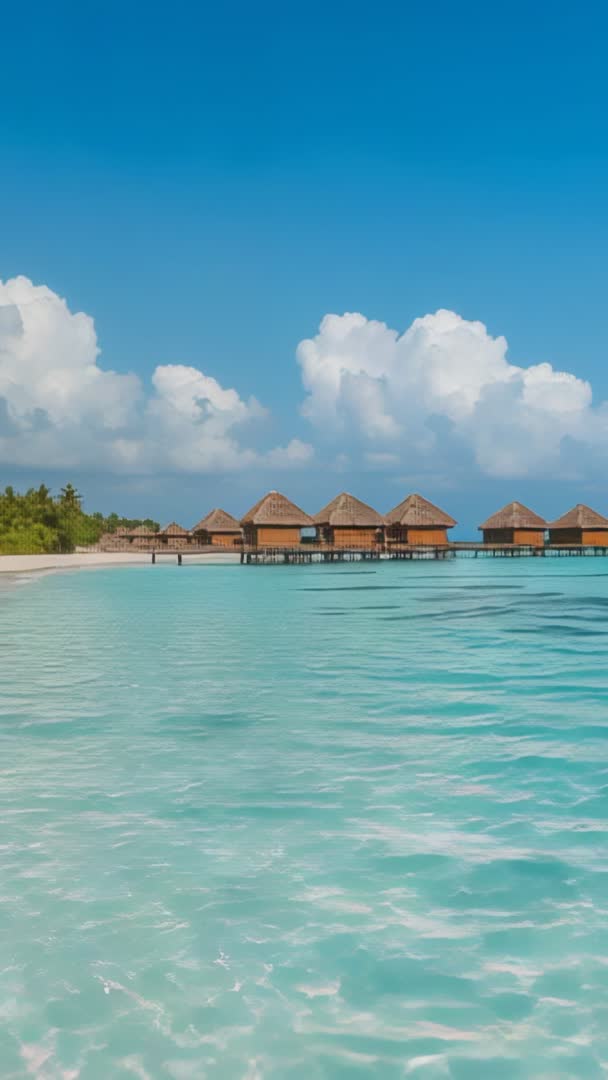 AI Generated Image. Vertical footage showing camera panning across turquoise lagoon toward overwater bungalows and palm-lined beach. Serving travel promos, resort website hero loops, social media reels, vertical ads, mobile wallpapers. Helping promote luxury island escapes, honeymoon packages, wellness retreats, destination weddings, sustainable tourism. Offering space for titles and overlay copy in open sky and water areas. Loopable and color grading friendly for seamless vertical playback on Instagram Stories, TikTok, Snapchat, mobile web banners, digital signage.