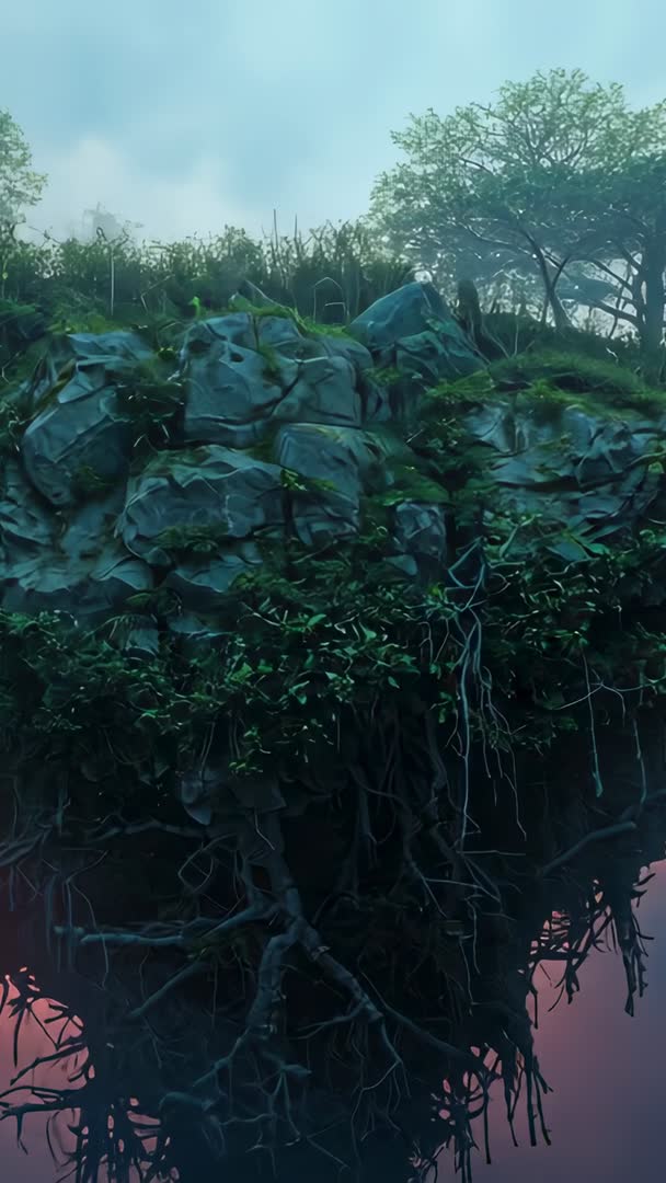 AI Generated Image. Vertical video panning upward, revealing floating island suspended over pink-blue sky. Floating landmass featuring rugged rock faces, moss-covered surfaces, tangled hanging roots, and solitary tree shrouded in soft mist. Cinematic lighting combining cool teal highlights with warm pink backlight, creating ethereal, mysterious mood. Suiting sci-fi and fantasy trailers, game environment backgrounds, concept art showcases, book covers, mobile vertical ads, social media reels and stories, title cards, and VFX reference. Editing suggestions: loop slow upward pan for seamless background, add low ambient drone and gentle wind for depth, layer subtle chime or bell tones for wonder, boost teal-pink contrast for cinematic pop. Vertical 9:16 composition optimized for mobile-first platforms and storytelling sequences.
