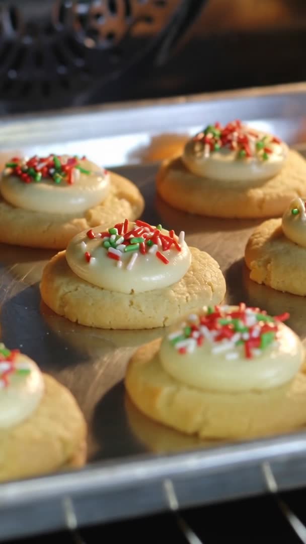 AI Generated Image. Vertical video placing tray of iced sugar cookies with creamy frosting and red, white and green sprinkles into oven for gentle baking until golden. Close-up vertical framing focusing on texture of cookie edges, glossy icing, and festive sprinkles. Warm oven light creating soft highlights and shallow depth of field for appetizing food styling. Use for baking tutorials, holiday recipe videos, seasonal marketing campaigns, social media reels, and culinary blogs. Suitable for bakery branding, packaging mockups, menu promotions, cooking class promos, and online ad content. Recommend adding on-screen recipe steps, voiceover narration, or upbeat holiday music for engaging short-form content.