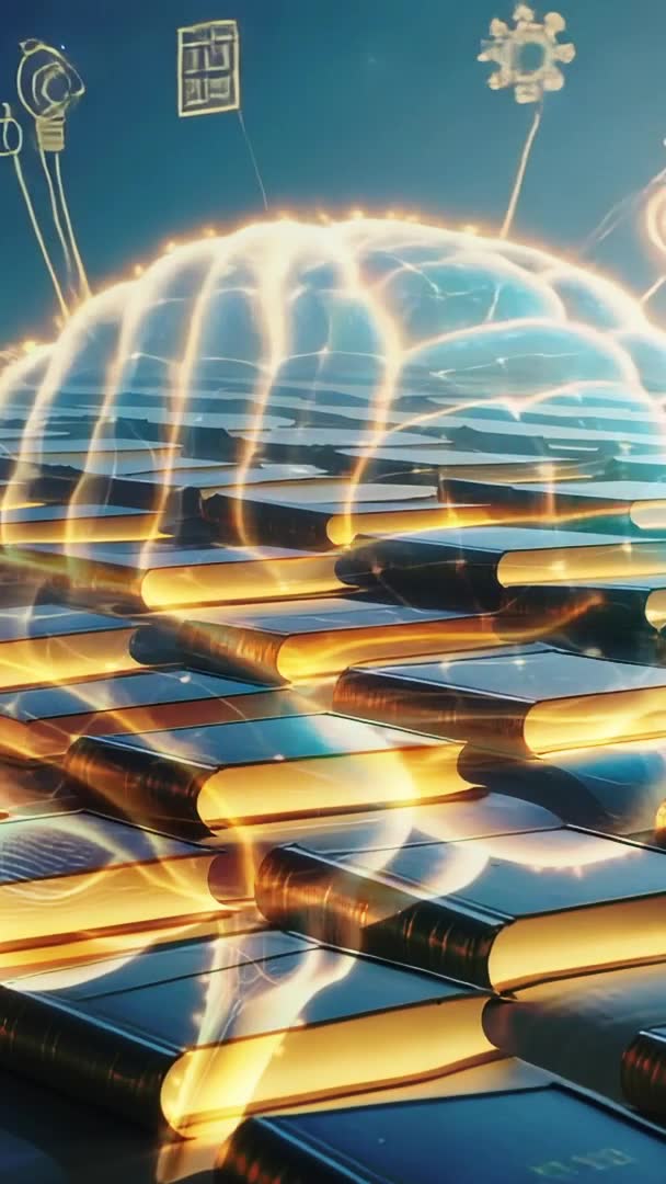 - Vertical video powering digital grid sending pulses under 3D brain outline with floating icons