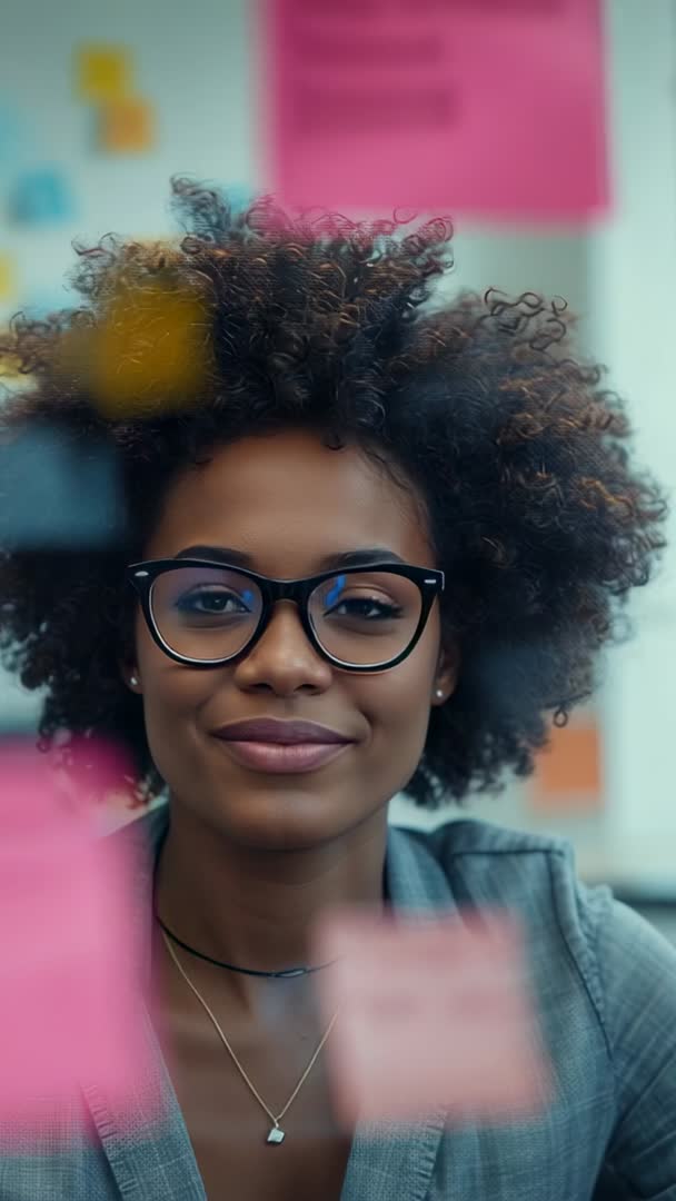 AI Generated Image. Vertical video showing close-up of woman wearing glasses, closing eyes briefly while adjusting pink sticky note on board filled with colorful notes. Scene conveying focused creativity and calm confidence, highlighting collaborative energy during brainstorming. Serving well for mobile-first marketing, social media reels, productivity tutorials, team training, startup culture videos, UX design workshops, agile sprint highlights, blog hero sections, corporate presentations. Pairing easily with upbeat background music, subtle sound design, or voiceover guiding planning steps. Cropping friendly for portrait format and ready for editing into short clips for Instagram Reels, TikTok, Snapchat, LinkedIn, and landing page hero modules. Using for headlines about ideation, planning, creative process, teamwork, female leadership, workplace innovation.