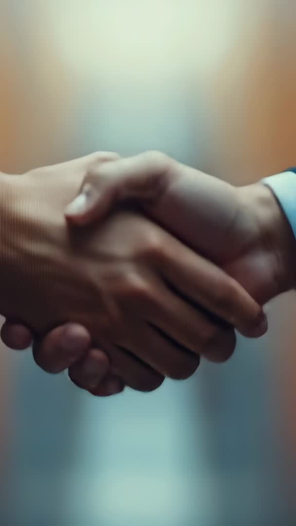 AI Generated Image. Video showing two professionals shaking hands in office hallway with close-up on firm grip and suit cuff visible. Warm shallow depth of field and blurred corridor background conveying trust, agreement, and professional rapport. Vertical framing optimized for mobile use and social stories, capturing moment of partnership and deal completion. Useful for corporate presentations, pitch decks, LinkedIn and social media posts, website hero banners, ad campaigns, onboarding and training modules, and press releases announcing collaboration. Recommended using as loopable clip for background visual, headline opener for business videos, or overlay with text and logo for promotional content.