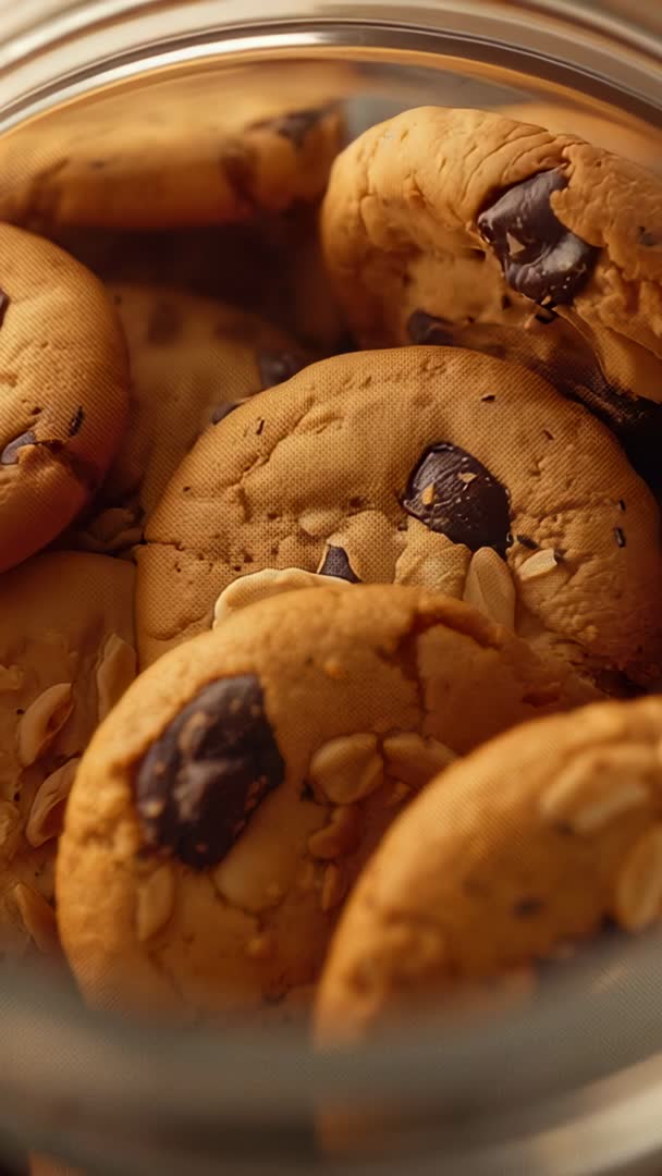 AI Generated Image. Vertical clip showing camera pulling back focus from glass jar packed with peanut chocolate chunk cookies. Close-up starting at jar rim then moving outward to reveal warm, crumbly cookies with visible peanut pieces and glossy chocolate chunks. Soft golden lighting casting cozy warmth and highlighting texture, crumbs, and chocolate shine. Footage evoking homemade comfort and rustic bakery vibe, creating indulgent dessert moment. Useful for food commercials, recipe videos, cooking blogs, social media ads, hero banners, bakery websites, and product packaging mockups. Tailored for vertical-first platforms like Instagram Reels, TikTok, Stories, and mobile ads. Color grading recommended toward warm, golden tones for appetizing look. Clip working well as short promo opener, loopable background, or product spotlight.