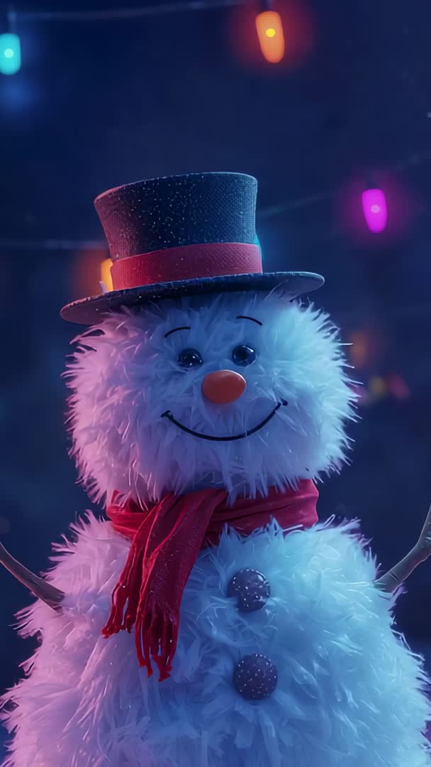 AI Generated Image. Vertical 9:16 video pulling back on fluffy smiling snowman wearing top hat and red scarf in snowy night, revealing string of colorful glowing bulbs and soft bokeh lights. Cool blue and magenta lighting creating cozy holiday mood while gentle snowflakes drifting through frame. Close-up on expressive face and textured fluffy body with sparkly button details providing tactile, handcrafted look. Composition offering clear foreground subject with decorative lights receding into background, creating depth and cinematic feel. Suitable for Instagram Reels, TikTok, Stories, mobile ads, e-commerce holiday banners, seasonal greeting clips, storefront displays, and kids content. Editors wanting loopable festive clip finding easy loop points in pull-back motion. Color grading flexibility allowing warm or cool edits, soundtrack adding chimes or sleigh bells for quick seasonal promos.