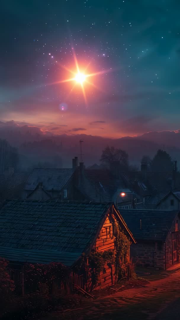 AI Generated Image. Vertical video showing pulsing celestial object moving across starry twilight while bathing rural cottage lane in warm orange glow. Camera panning slowly over slate rooftops, wood-clad cottages and narrow cobblestone path; front-porch lamp flickering in response to sudden burst of light. Misty hills and scattered stars creating deep atmospheric layers and cinematic contrast between cool night tones and warm foreground illumination. Use cases: Ideal for cinematic openers, sci-fi short scenes, atmospheric trailers, vertical social media ads, mobile wallpapers, meditation or relaxation videos, book and album motion covers, seasonal storytelling and promotional reels. Production tips: adding low-frequency hum and soft choir for otherworldly mood, keeping slow camera moves and gentle color grade to preserve warm-cool contrast, incorporating subtle lens flare and layered ambient sound design for immersive realism.