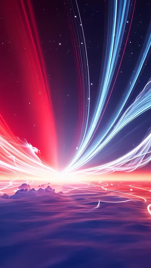 AI Generated Image. Vertical 9:16 clip showing pulsing cosmic glow sending red and blue energy arcs above cloud ocean with distant stars. Featuring vivid neon color palette, flowing light trails, and soft horizon bloom creating sense of depth and motion. Working great for mobile backgrounds, Instagram Reels, TikTok content, app intros, and vertical ad campaigns. Fitting for sci-fi trailers, music visuals, festival promos, meditation or visionary branding, and futuristic UI animations. Loop-friendly composition offering smooth start and end transitions. Providing high contrast area for overlaid text, logos, or call-to-action elements. Delivering energetic, mystical mood suitable for tech, entertainment, and creative projects.