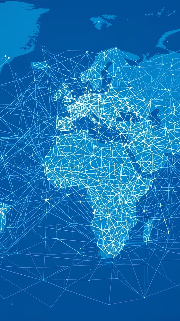 AI Generated Image. Showing vertical animation of glowing digital network tracing Africa coastline while nodes pulse and lines connect. Featuring Europe cluster intensifying into bright hub, suggesting rising data traffic and connectivity growth. Using deep blue palette with neon cyan highlights, conveying futuristic tech and secure data flow. Fitting tech presentations, telecom ads, fintech promos, social media vertical ads, event openers, website hero sections, and mobile app intros. Providing loopable sequence for background motion or intro clip for corporate videos, explainer animations, and broadcast graphics. Delivering high-tech mood for stories about global connectivity, internet infrastructure, data networks, and digital transformation.