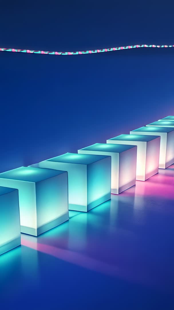 - Vertical video pulsing glowing cubes shifting cyan to pink along reflective dark hall