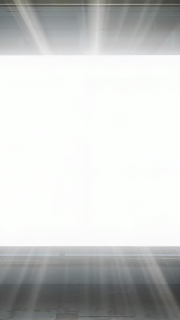 AI Generated Image. Presenting vertical clip featuring pulsing overexposed panel emitting radiant light rays within minimalist interior frame. High-key center brightness creating expansive negative space for overlaying copy, logos, product shots. Metallic top and bottom borders framing luminous rectangle and adding architectural contrast. Motion capture showing soft beam diffusion and subtle exposure flicker, allowing seamless looping for ambient background use. Ideal for title sequences, app preview screens, mobile ad banners, product reveal reels, technology or architecture branding, modern advertising, social media stories. Editing suggestions include applying slow zoom or parallax for added depth, adjusting color grading to introduce subtle tint, adding typographic overlays or lower thirds, and syncing pulsing effect with audio for cinematic impact. Supplied in vertical 9:16 format for direct use in smartphone video, story ads, and portrait-first web campaigns.