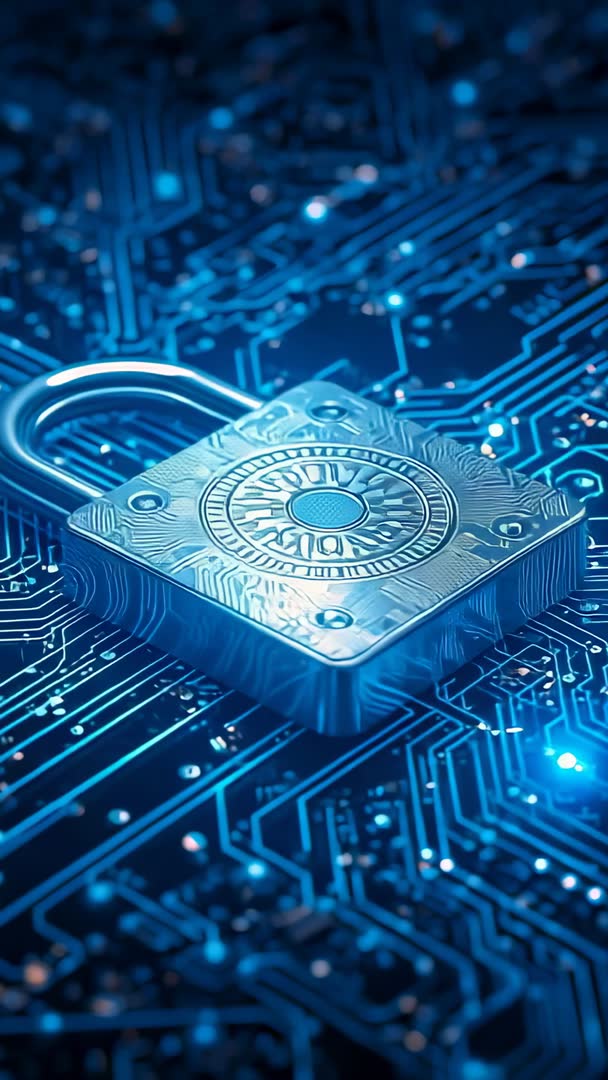AI Generated Image. Video showing close-up of metallic padlock resting on illuminated circuit board, pulsing data nodes and light trails highlighting secure data flow during startup. Cinematic blue lighting and shallow depth of field creating high-tech, tactile metallic detail. Ideal for opening sequences in cybersecurity presentations, explainer videos about encryption and data protection, tech website hero sections, corporate security reports, and marketing for secure cloud services. Suitable for vertical social ads, app onboarding screens, conference intros, and product demo overlays. Loopable composition allowing seamless repeat for background use. Color grading and contrast optimized for integration with text overlays and motion graphics.