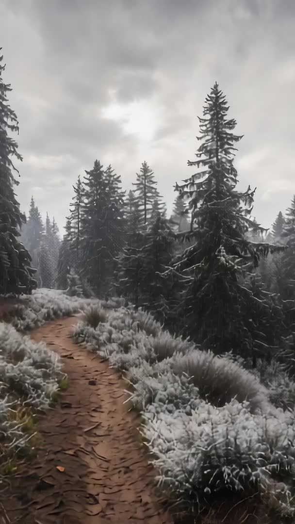 AI Generated Video. Vertical footage pushing through frost-dusted spruce forest along winding dirt trail, revealing low mist and overcast sky. Slow forward movement creating immersive walk-through feel, accentuating texture of snow-dusted grasses and rough trail surface. Mood reading cold, tranquil, atmospheric, suitable for seasonal intros, nature documentaries, hiking brand ads, weather segments, meditation and wellness videos. Footage working well as background for vertical social media reels, smartphone travel edits, outdoor gear promotions. Suggested post production: keeping slow pace, adding soft ambient wind or crunching leaves sound, applying subtle cool color grade or boosting warm highlights for contrast, overlaying animated titles on sky area or trail foreground. Deliverable options: looping short segment for seamless Instagram Reel or TikTok, combining with voiceover narration for travel guide, using as opening shot for longer forest journey.