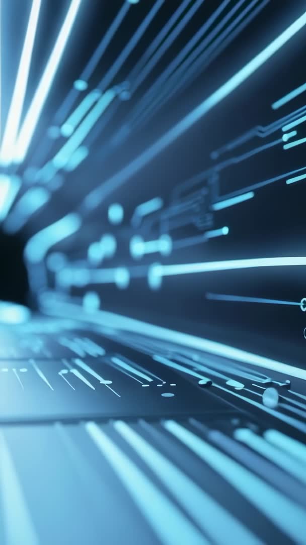 AI Generated Image. Featuring camera speeding through neon blue circuit tunnel, digital nodes pulsing with light and motion blur creating sense of velocity. Visual palette focusing on deep blues and cyan highlights, producing futuristic and immersive mood. Ideal for tech product launches, blockchain presentations, cybersecurity promotions, app intros, social media reels, vertical ads, event openers. Supporting seamless loop for continuous playback and simple overlay of logos, lower thirds, and text. Optimized for mobile platforms with 9:16 vertical aspect ratio. Useful as hero video for websites, background for title sequences, or attention-grabbing clip for ads and pitch decks.