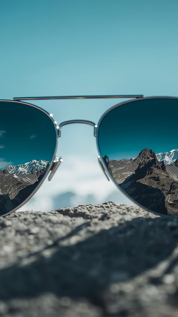 - Vertical video racking focus on aviator sunglasses reflecting alpine peaks and rugged summit