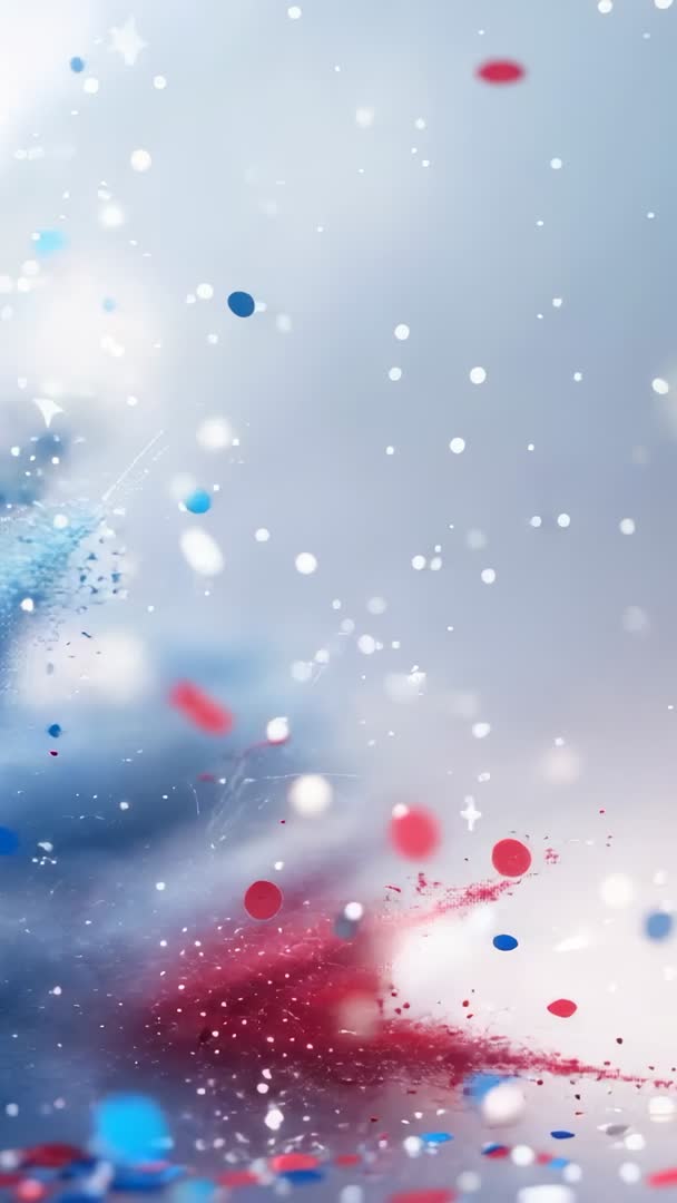 - Vertical video red white blue confetti particles bursting and fading over pale blue bokeh