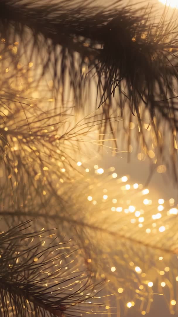 AI Generated Video. Shifting camera revealing conifer branch and needles sparkling with dew drops in warm golden hour backlight. Capturing soft, shallow depth of field and luminous bokeh highlights for intimate, cinematic mood. Serving as calming background for meditation apps, wellness promos, spa content, nature documentary openers, and seasonal holiday intros. Providing ideal vertical 9:16 footage for social media reels, mobile ads, and full-screen website hero banners. Recommending gentle slow-motion or seamless looping to emphasize shimmer and atmosphere while preserving natural warm tones.