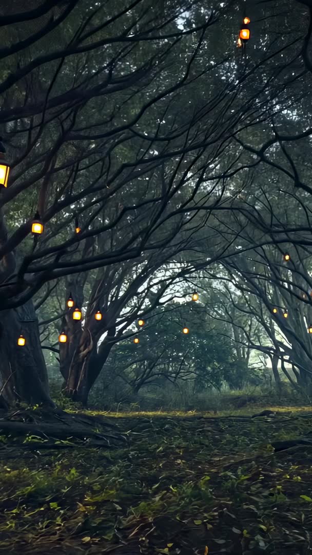 AI Generated Image. Vertical clip showing camera advancing through arching tree tunnel, lanterns glowing among twisted branches, mist drifting over distant clearing. Mood blending dusk, mystery, and calm, with warm amber light contrasting cool green canopy. Useful for opening sequence for fantasy film, title sequence for nature documentary, background for meditation and mindfulness app, or vertical short for Instagram Reels, TikTok, and mobile ads. Editing tips include slowing footage for cinematic reveal, adding soft ambient music and subtle particle effects, applying teal-green color grade for moody contrast, and overlaying centered vertical text or logo for title cards.