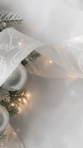 - Vertical video revealing frosted evergreen, white ribbon and matte baubles with warm lights