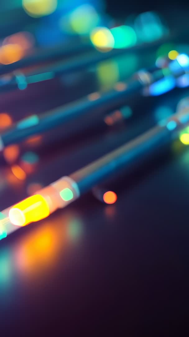 AI Generated Image. Vertical shallow-focus video showing glowing fiber optic rods lying on dark surface, pulsing multicolor LEDs and creating soft bokeh highlights in cyan, magenta, orange, yellow. Pulling focus from foreground to background, creating dreamy blur and dynamic light streaks. Mood feeling futuristic and festive, with cool cyan and warm orange contrast. Perfect for mobile adverts, Instagram Reels, TikTok stories, hero sections on technology websites, product launch promos, music visualizers, background loops for presentations, event visuals. Use with upbeat electronic soundtrack and subtle lens flare overlay to enhance motion. Deliver as 9:16 vertical clip, trim for seamless loop, add color grade to match brand palette. Ideal for illustrating fiber networks, lighting design, digital connectivity, creative tech concepts, holiday lighting, party atmospheres. Licensing friendly for commercial, editorial, and social media projects.