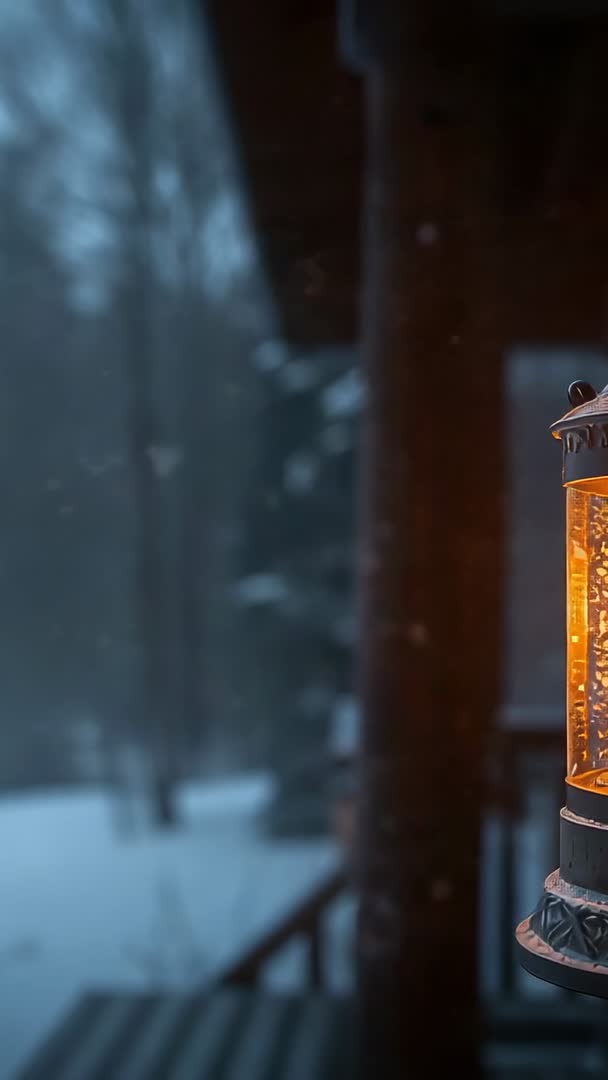 AI Generated Video. Showing camera shifting to reveal ornate lantern glowing with warm amber light on snowy cabin porch at dusk. Featuring soft-focus background of snow-covered trees and gentle falling snow, cool blue tones contrasting warm lantern glow. Using vertical frame and shallow depth of field for cinematic mobile presentation. Suitable for smartphone reels, stories, vertical ads, and hero background loops. Suggesting usage in winter holiday campaigns, rustic cabin hospitality promotions, seasonal greeting videos, and atmospheric social media content. Recommending editing techniques including slow zoom, subtle vignette, color grading to emphasize amber-blue contrast, and seamless looping for continuous playback.