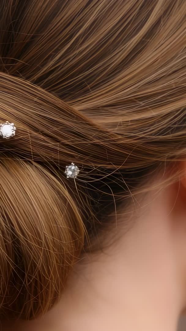 AI Generated Video. Shifting camera revealing low twisted bun at back of head, showing two crystal pins sparkling against light brown hair. Close-up emphasizing smooth texture, loose wisps, and rhinestone detail for glamorous finish. Soft warm lighting creating elegant mood. Usage ideas: Suiting bridal promotional clips, salon social posts, hairstylist portfolios, hair accessory ecommerce, wedding vendor reels, hair tutorial intros, editorial beauty segments. Vertical format suiting Instagram Reels, TikTok, Stories and mobile-first advertising. Clip providing detailed cutaway for product closeups, styling step demonstrations, before-and-after sequences, and mood-driven hero clips.
