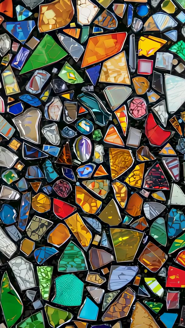 AI Generated Video. Moving camera revealing mosaic glass panel, showing shifting highlights dancing across tessellated shards and iridescent surfaces. Close-up vertical video capturing texture, color and reflective interplay with shallow depth. Palette featuring warm amber, emerald green, cobalt blue, ruby red and smoky gray highlights. Mood conveying vibrant, artistic and tactile energy with meditative sparkle. Ideal for social media reels, mobile backgrounds, product promotions, art and design documentaries, museum exhibit loops, stage projections and website hero banners. Use as looping background for title cards, transitions or overlay for promotional content. Editing tips: apply slow cinematic pan, subtle parallax, color grade to match brand, sync with ambient or electronic soundtrack, export loopable 6-12 second clips for vertical platforms. Useful for designers, architects, advertisers and content creators seeking handcrafted mosaic detail and rich reflective texture.