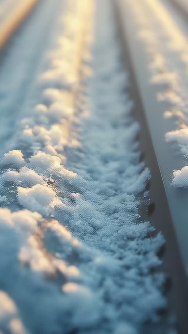 AI Generated Image. Vertical video showing sliding camera along snow-covered railway rails, highlighting textured metal strip and repeating track lines in soft morning light. Narrow depth of field creating bokeh bands and warm golden highlights contrasting cool blue snow. Serving as atmospheric winter visual for travel, transport, weather, or industrial themes. Working well for social media reels, mobile-first backgrounds, broadcast openers, editorial sequences, seasonal marketing, or website hero panels. Providing loop-friendly motion for overlays and title crawls and pairing with slow-motion or time-lapse footage for extended sequences. Fitting 9:16 vertical format and offering cool blue palette with warm rim light for color grading and graphic treatments.