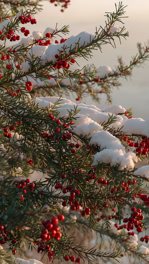 AI Generated Video. Vertical footage shifting gently along snow-dusted evergreen branches, revealing clusters of vibrant red berries backlit by warm golden hour sunlight. Close-up framing highlighting needle texture, delicate snow layers, and glossy berry surfaces with soft bokeh background. Lighting creating warm rim glow and cool snow tones, evoking festive yet peaceful mood. Composition offering natural negative space for text overlays and vertical title cards. Use cases: Working well for holiday marketing, seasonal social media reels, Instagram and TikTok ads, greeting card animations, TV commercials, website hero loops, calming background for wellness and meditation apps, nature documentary inserts, retail display visuals. Loop-friendly motion supporting slow motion treatment, color grading, and ambient sound design to enhance mood. Technical notes: Shot optimized for 9:16 vertical aspect, compatible with 4K workflows, recommended frame rates 24-60fps, safe for looping and trimming. Ideal for editors seeking warm backlit nature b-roll or festive seasonal footage.