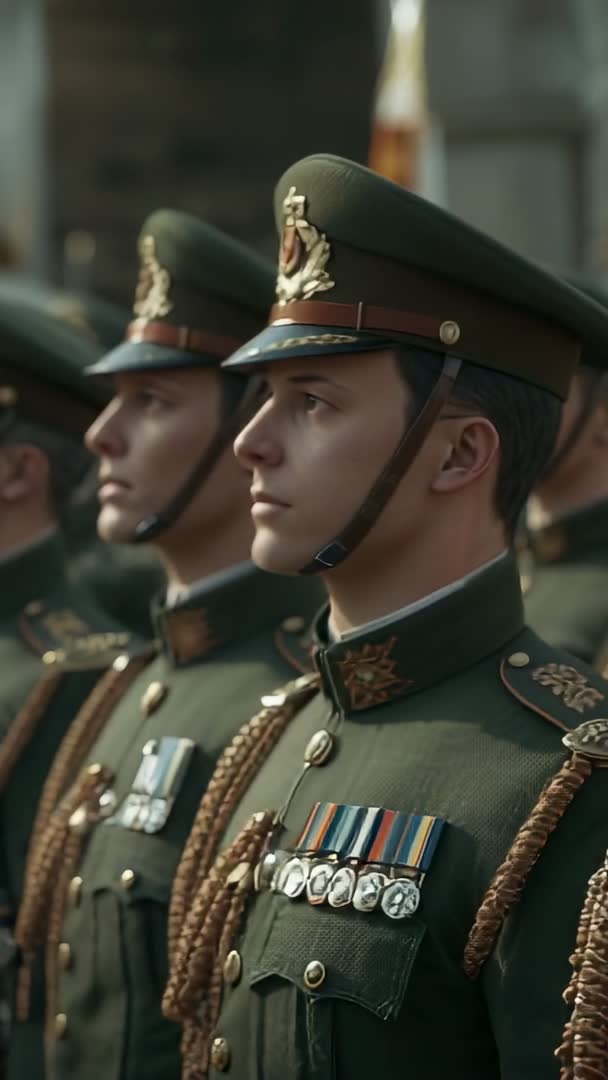 AI Generated Image. Vertical cinematic clip showing camera pulling back to reveal soldier standing in formation, wearing dark green ceremonial uniform and rows of medals. Close-up profile and chest ribbons creating emotional focus, shallow depth of field isolating subject with soft flag blur in background. Working well for social media reels, mobile-first advertising, broadcast intros, documentary sequences, military commemoration, and ceremony coverage. Editing ideas: using slow-motion pullback, adding gentle rack focus, applying warm cinematic color grade, layering ambient orchestral track and heightening solemn mood. Use as opener for tribute videos, news packages, promotional campaigns, or educational pieces on military tradition and ceremonial protocol.