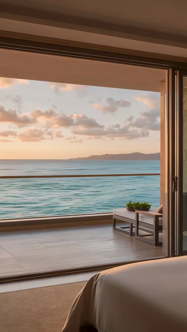 AI Generated Video. Vertical video featuring gentle camera zoom revealing sunlit ocean view from luxury suite balcony at sunset. Warm golden light spreading across hardwood floor and bed, glass doors sliding open to turquoise sea and distant island silhouette. Composition framing balcony railing and low table with potted plant, bed corner in foreground adding depth and sense of arrival. Colors shifting from peach sky to cool teal water while soft waves creating rhythmic motion. Clip running vertically (9:16) and optimized for social media reels, mobile advertisements, and website hero sections. Usage ideas include hotel and resort promo, travel campaign hero clip, vacation rental listing, wellness and meditation background, luxury lifestyle reel, real estate presentation for oceanfront property, calming lobby display, screensaver or loopable background for retail and hospitality. Technical notes: slow smooth zoom, natural ambient light, shallow depth of field, loop friendly length.