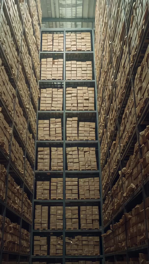 AI Generated Image. Vertical video panning up central highbay rack aisle, revealing towering rows of stacked cardboard boxes and pallets. Camera tilting upward, emphasizing height and storage density while creating dramatic vertical perspective and vanishing point. Overhead industrial lighting and steel racking conveying scale and industrial atmosphere. Showing organized high-density inventory with clear pallet labeling and narrow aisle composition. Ideal for B-roll in logistics, supply chain, warehouse operations, e-commerce fulfillment, industrial architecture, and inventory management projects. Usage ideas: apply slow motion to emphasize scale; use speed ramp for dynamic reveal; overlay animated graphics to display inventory counts or flow metrics; add voiceover about distribution or fulfillment process; color grade for cool industrial tones. Showing vertical format optimized for mobile and social platforms, suitable for Reels, TikTok, Instagram Stories, and vertical ad placements. Licensing suggestions: corporate promo, training module, news package, website hero video, background for logistics presentations.