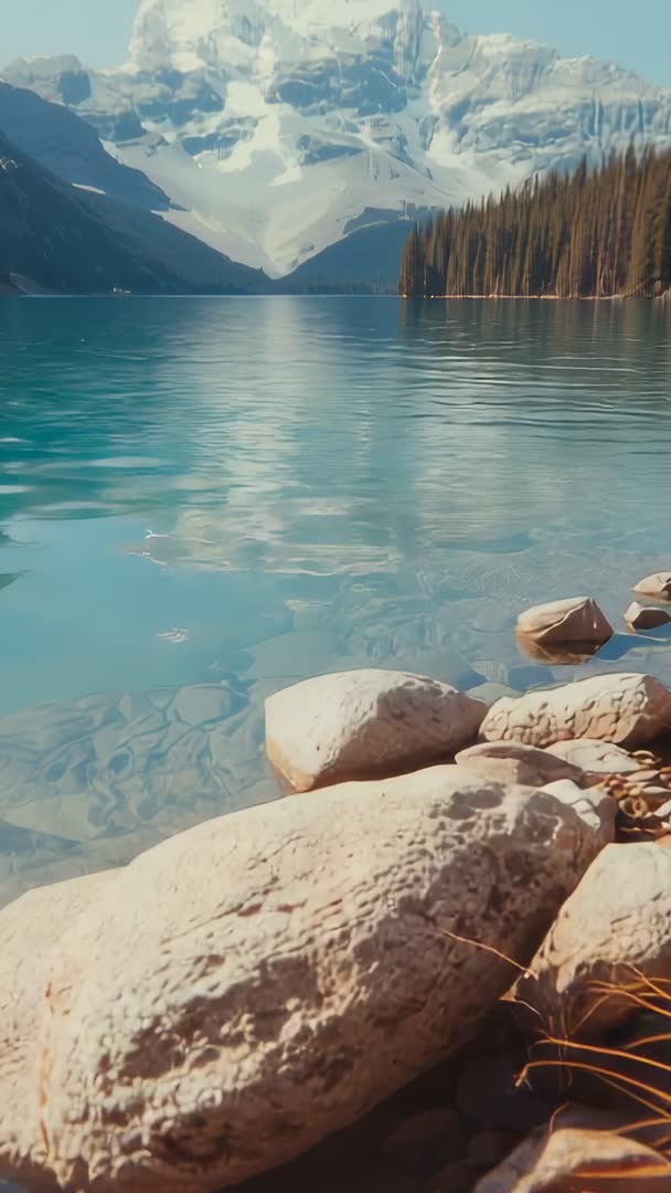 AI Generated Image. Footage showing close-up boulders on shore while camera is tilting up to reveal turquoise glacial water and distant snow-capped peaks reflecting on calm surface. Morning light is casting warm highlights on foreground rocks while evergreen tree line is framing distant mountain ridge. Clip is recording in vertical 9:16 aspect ratio with smooth tilt ideal for mobile-first platforms. Use for travel ads, Instagram Stories, TikTok reels, mobile website hero, outdoor gear promos, nature or wellness apps, and cinematic social content. Clip is offering room for color grading, ambient soundscape or voiceover, and slow-motion inserts to emphasize tranquility and scale.