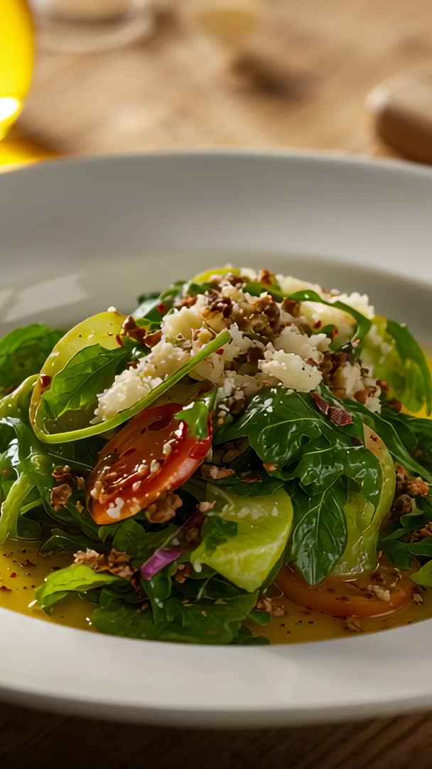 AI Generated Image. Shifting camera revealing fresh green salad with vinaigrette glistening, crumbled cheese, cherry tomatoes and chopped nuts. Vertical framing and close-up detail offering strong mobile-first visual for social reels, stories and recipe video openers. Warm wood background and soft bokeh creating cozy, rustic mood and emphasizing fresh textures. Vivid greens, glossy tomatoes, crumbly cheese and crunchy nuts adding appetite appeal and tactile interest. Working well for cooking blogs, restaurant menu hero clips, healthy lifestyle campaigns, food delivery app banners, culinary class promos and packaged food advertising. Editing-friendly footage providing clean composition for adding text overlays, logo reveals and ingredient callouts.
