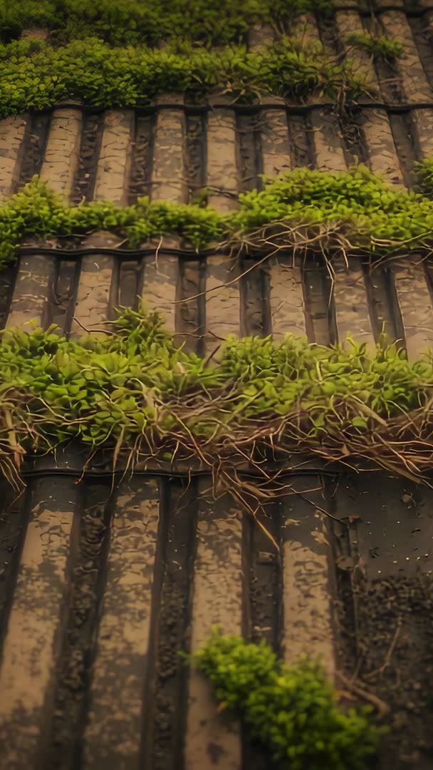 AI Generated Image. Vertical tracking shot revealing weathered corrugated roof tiles layered with bright green moss and interlaced roots. Camera moving upward along tile ridges, focusing on close-up texture, cracked glaze, damp surface, and contrasting green bands. Composition emphasizing repeating pattern and organic intrusion into manmade structure, creating moody, tactile visual. Lighting exhibiting warm tones and soft shadows for atmospheric feel. Usage suggestions: - Use as background loop for vertical mobile ads, social media stories, or app splash screens. - Use as b-roll for roofing inspection videos, maintenance tutorials, or restoration before-and-after sequences. - Use in environmental or urban decay documentaries showing nature reclaiming built environment. - Use for architectural texture studies, pattern design references, or nature-themed marketing materials. Technical notes: - Shot optimized for vertical editing and portrait aspect ratios. - Color grading working well with warm vintage tones or cool neutral tones depending on mood. - Add voiceover or on-screen text in top third for instructional or promotional content.