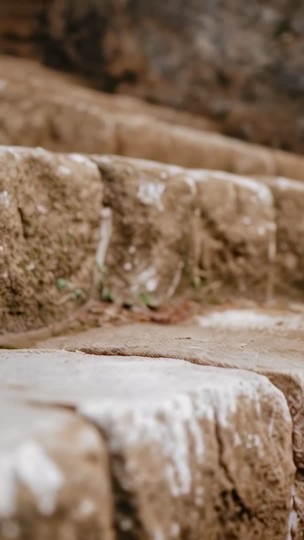 AI Generated Video. Vertical clip showing slow upward pan over worn stone steps at ancient ruin, revealing white pebble, moss patches, and weathered edges. Shallow depth of field and textured surfaces creating moody, tactile atmosphere for historic or nature-themed projects. Ideal for use as establishing B-roll in travel videos, heritage documentaries, architecture reels, and social media vertical ads. Works well as background for title cards, texture overlays, website hero panels, or mobile wallpaper. Color palette featuring warm earth tones and soft highlights, compatible with vintage grading and filmic LUTs. Pair with ambient footsteps, wind, or bird calls for immersive sound design. Suitable for promotional material for museums, tours, restoration campaigns, and educational content.