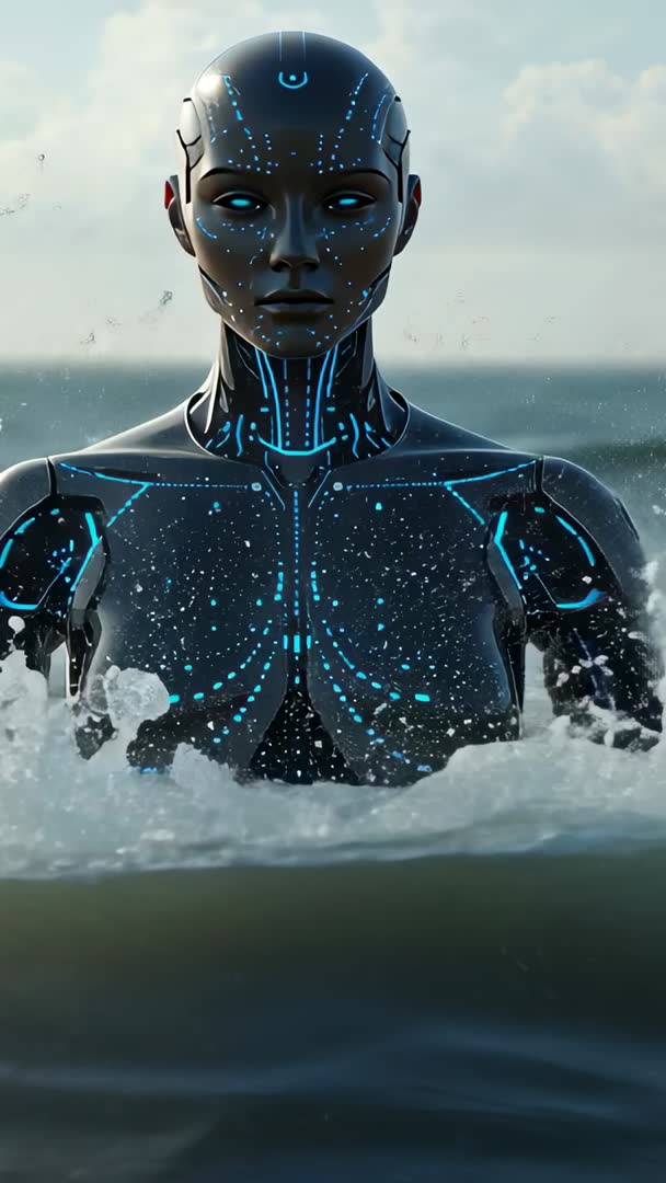 AI Generated Video. Vertical cinematic clip showing female humanoid android rising from ocean surf, illuminated by neon blue circuitry patterns across face and torso, scanning horizon with steady luminous gaze. Composition featuring waist-up close-up, waves splashing around shoulders, overcast sky backdrop, reflective black chassis with animated light nodes and subtle water droplets. Motion including head tilt, light pulses, camera push-in and splash choreography, creating dramatic reveal suitable for short-form vertical formats. Ideal for sci-fi trailers, technology promos, AI concept shorts, startup product launches, vertical social ads, app intros, channel openers and exhibition displays. Creative uses including placing overlay text in sky area, pairing with ambient electronic soundtrack, looping light-pulse segment for background, color grading toward cool teal for cinematic mood, and editing with slow zoom or parallax for immersive storytelling.