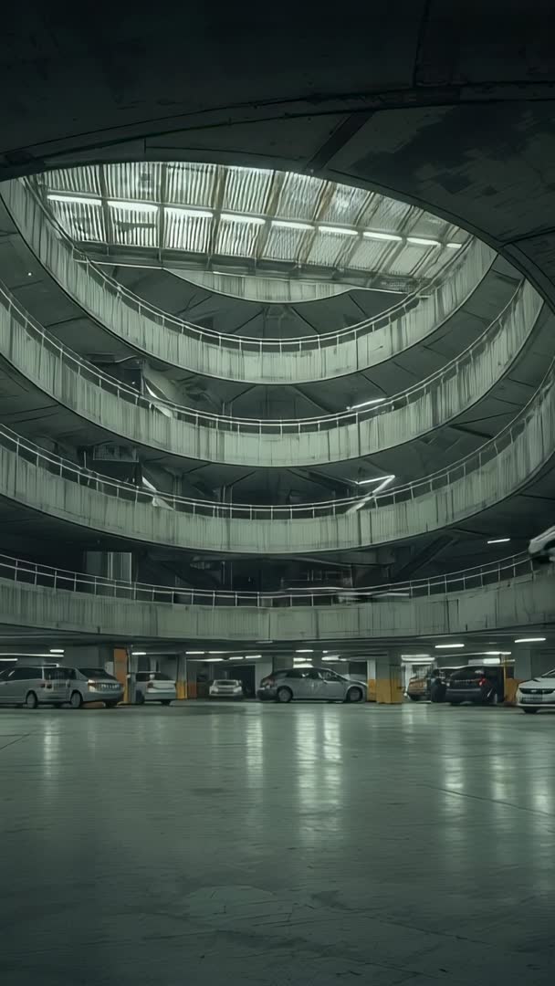 AI Generated Video. Rising camera revealing multi-level circular parking ramp beneath translucent skylight, showing parked cars, concrete railings, and polished floor. Featuring moody daylight, repeating lines, and bold geometric curves, offering cinematic industrial atmosphere. Making ideal footage for urban architecture reels, commercial openers, automotive promos, parking facility demonstrations, wayfinding tutorials, safety awareness clips, and ambient background for music videos. Allowing editors to crop for vertical or horizontal formats, add motion graphics or titles, and use as establishing shot for films, documentaries, or branded content.